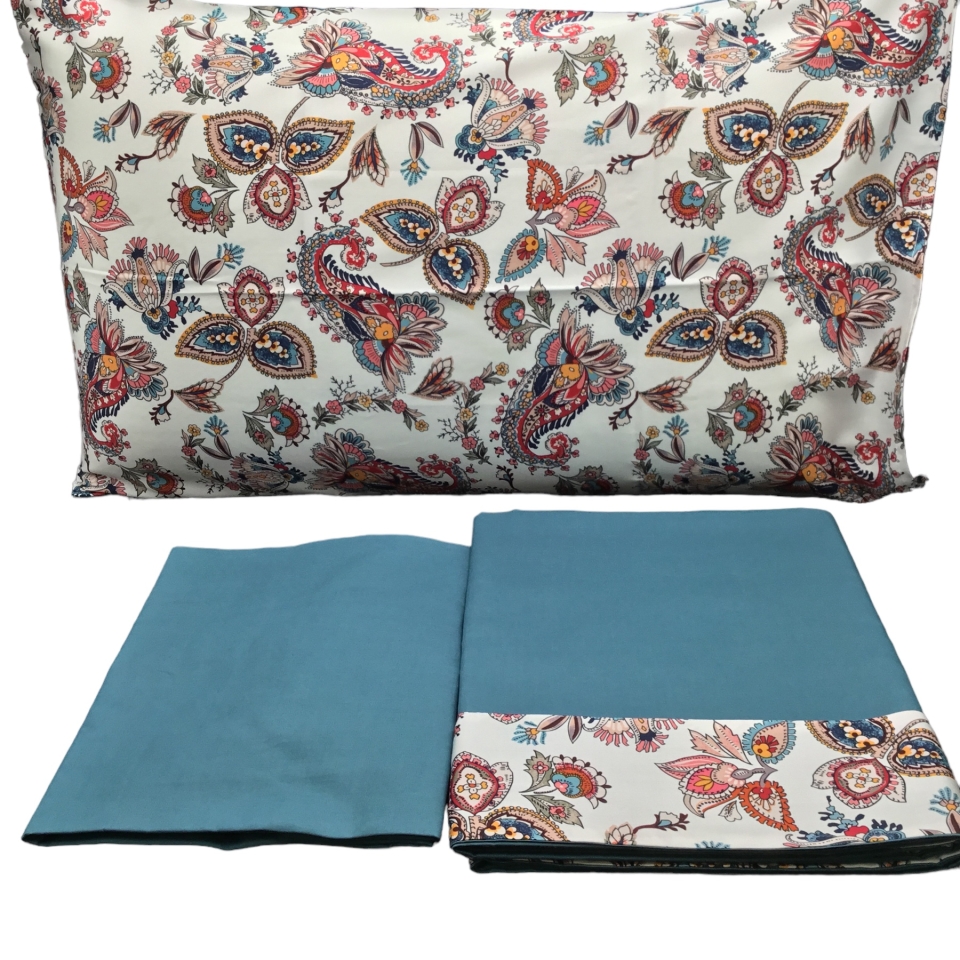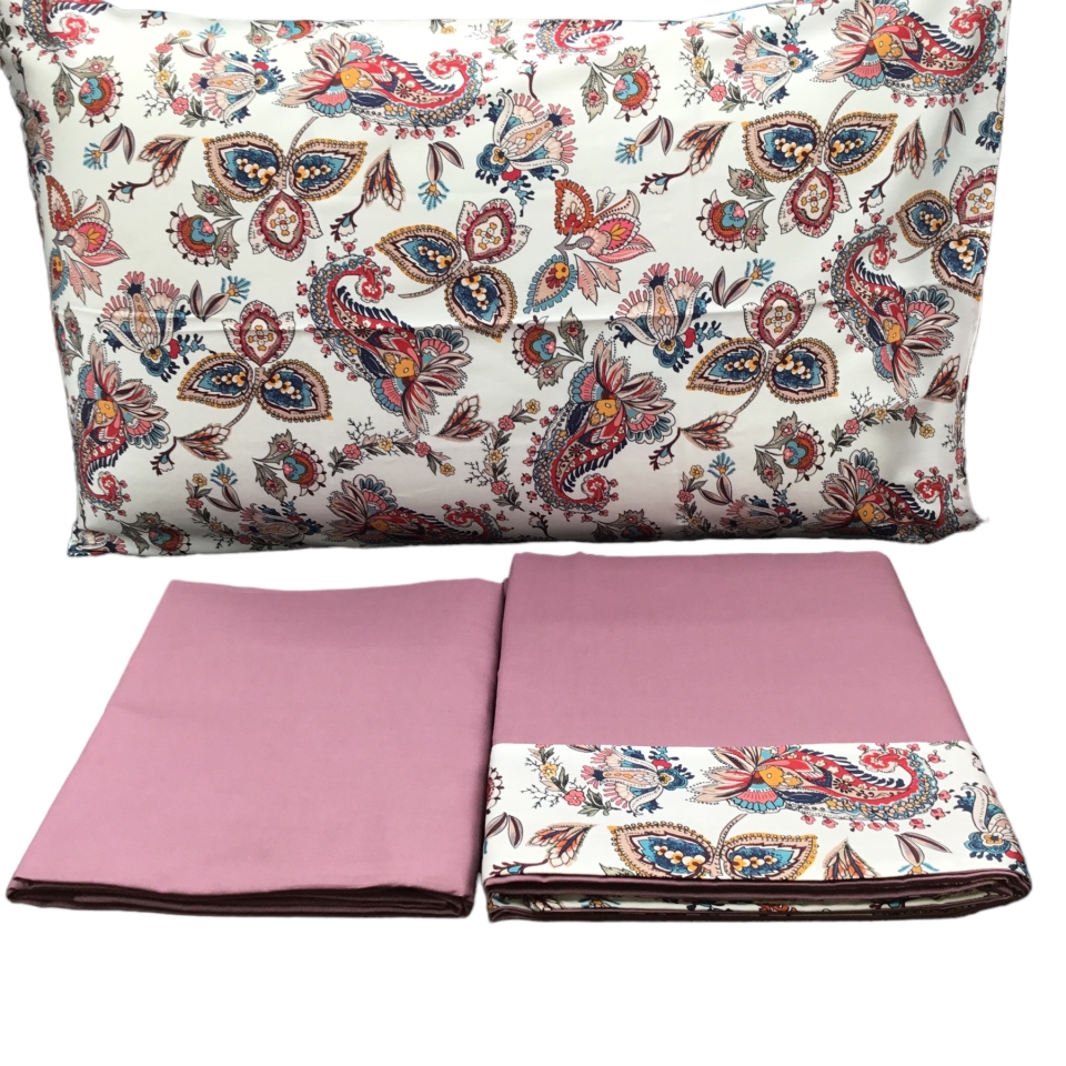 Lenzuolo sotto in tinta unita, lenzuolo sopra in tinta unita con rovescia a fantasia in raso, federe double face (un lato a fantasia di raso un lato a tinta unita), lavabile in lavatrice fino a 60°( per il primo lavaggio si consiglia di bagnare in acqua fredda).