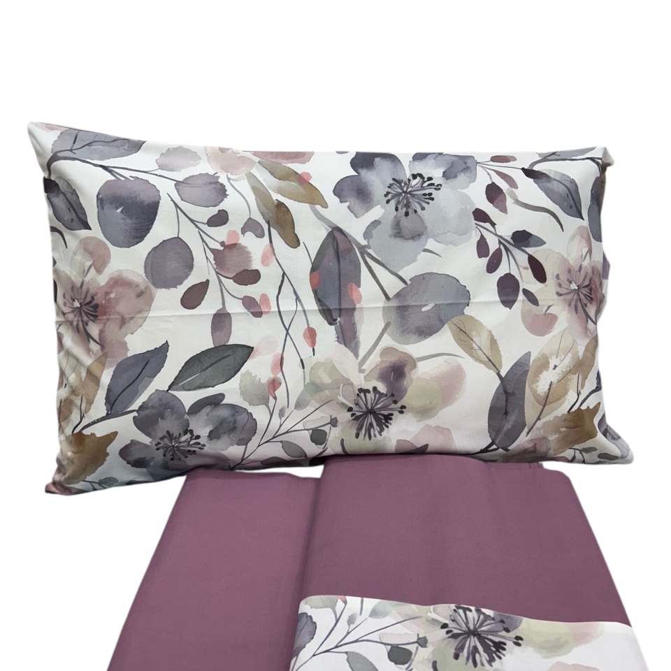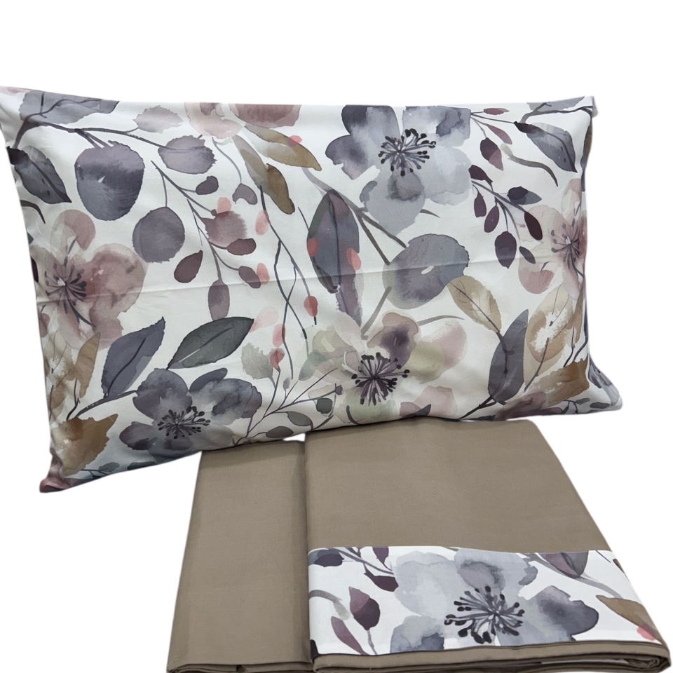 Lenzuolo sotto in tinta unita, lenzuolo sopra in tinta unita con rovescia a fantasia, federe double face (un lato a fantasia un lato a tinta unita), lavabile in lavatrice fino a 60°( per il primo lavaggio si consiglia di bagnare in acqua fredda).