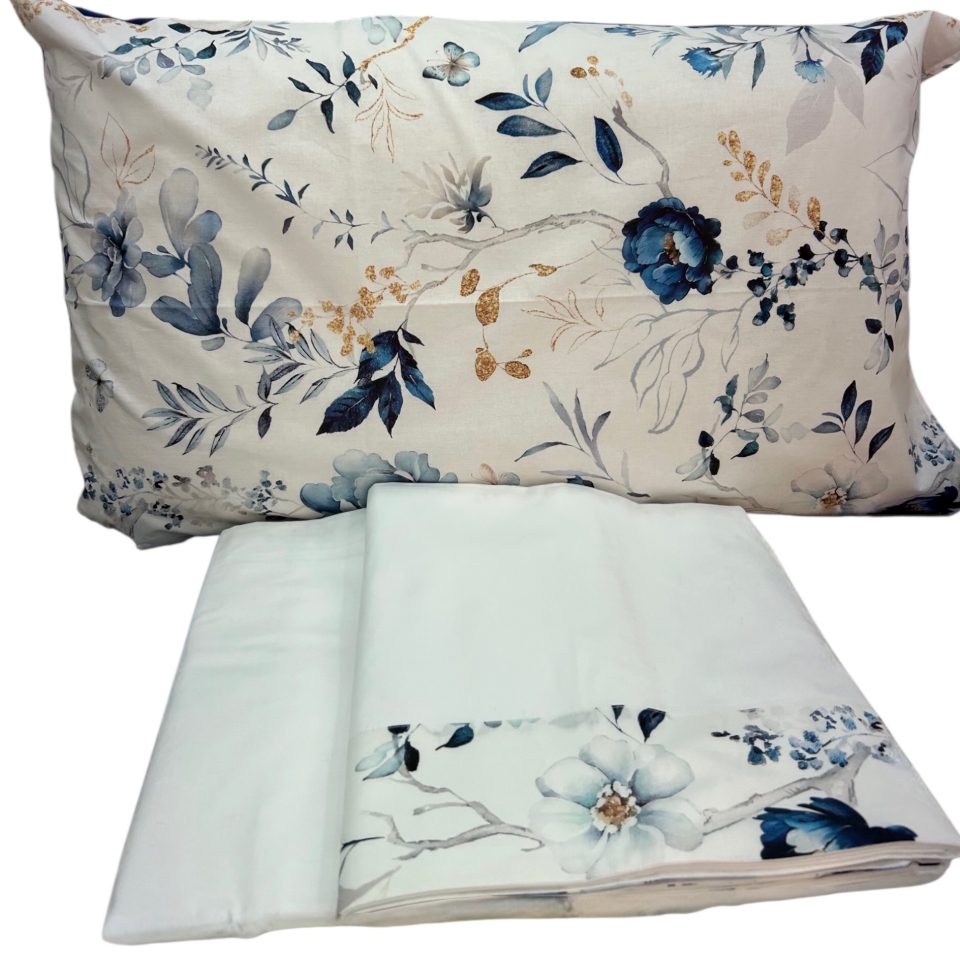 Completo di lenzuola di esclusiva nostra produzione composto da lenzuolo sotto con angoli, sopra e federe 100% percalle di puro cotone, disponibile in tutte le misure, standard , maxi e su misura.