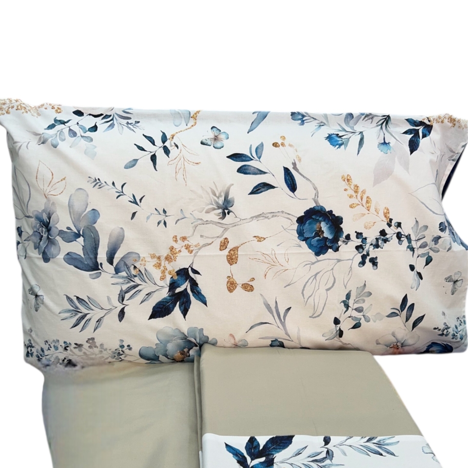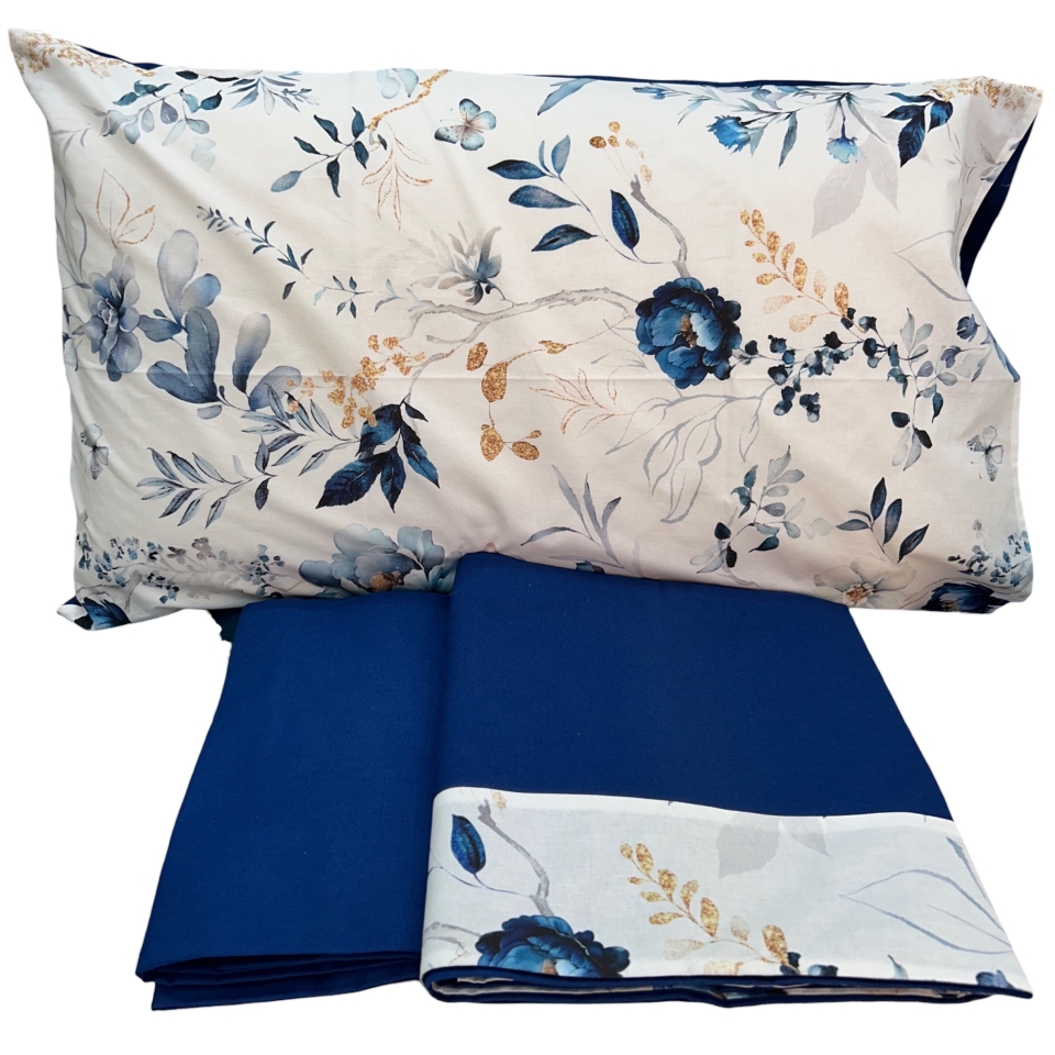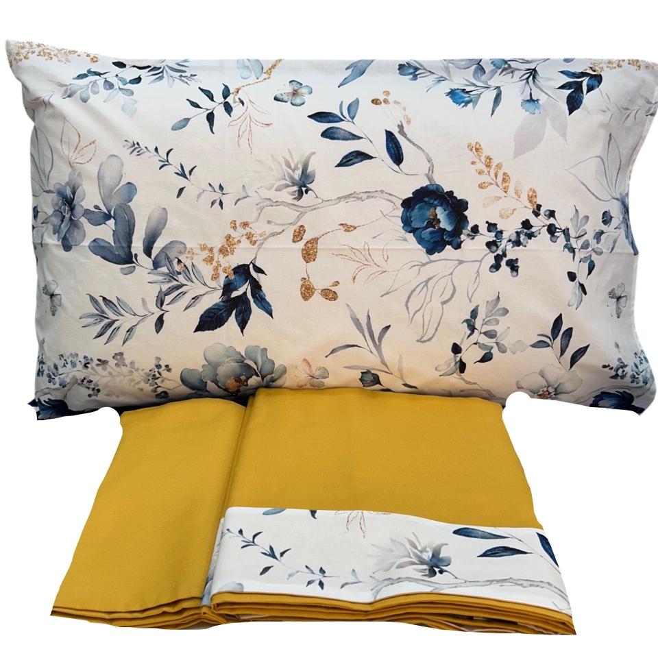 Lenzuolo sotto in tinta unita, lenzuolo sopra in tinta unita con rovescia a fantasia, federe double face (un lato a fantasia un lato a tinta unita), lavabile in lavatrice fino a 60°( per il primo lavaggio si consiglia di bagnare in acqua fredda).