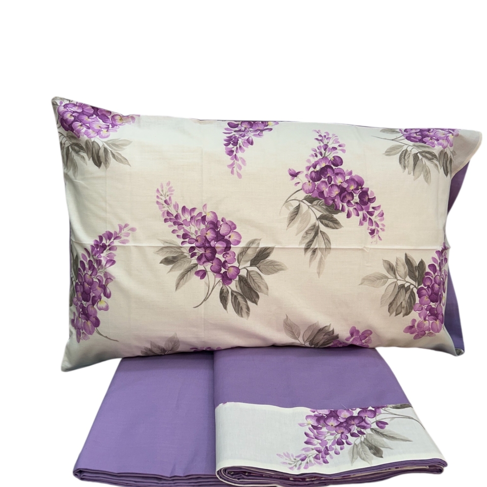 Completo di lenzuola di esclusiva nostra produzione composto da lenzuolo sotto con angoli, sopra e federe 100% percalle di puro cotone, disponibile in tutte le misure, standard , maxi e su misura.